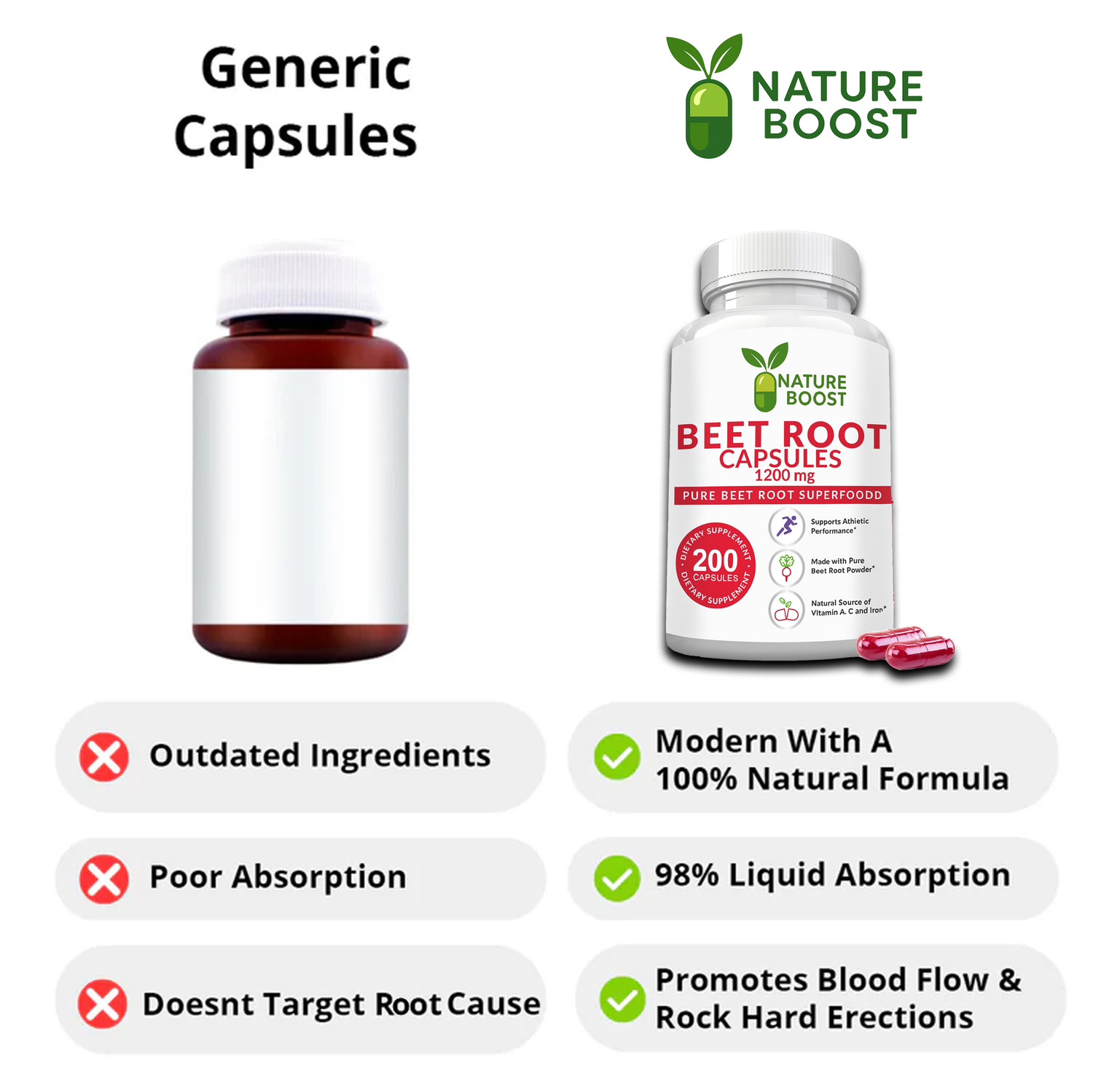 Nature Boost Beet Root Capsules stand out with a modern, 100% natural formula designed for superior results. Unlike generic supplements made with outdated ingredients, Nature Boost uses pure beet root powder for maximum nutritional value and performance support. Its advanced 98% liquid absorption ensures faster, more effective delivery of nutrients, promoting better circulation and overall vitality.